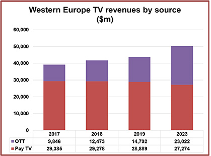 Middlesex, UK, Oct. 8, 2018 — Western European TV revenues will reach US$ 50 billion by 2023; up from US$ 39 billion in 2017, a new report has revealed. Digital TV Research said OTT revenues for TV episodes and movies (including AVOD) will more than double from US$ 10 billion to US$ 23 billion, which push OTT’s share of the total up from 26% to 46%. Pay TV revenues will fall by $2 billion over the same period.