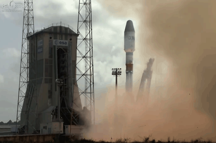 Le Centre Spatial Guyanais, Kourou, French Guiana , December 18, 2014: Arianspace successfully launched four satellites for O3b using a Soyuz rocket from the Space Center in French Guiana. The launch follows the successful launches of the first eight O3b satellites in two batches in June 2013 and July 2014, completing the initial constellation of 12 satellites for O3b's medium-earth orbit, all-Ka-band system.