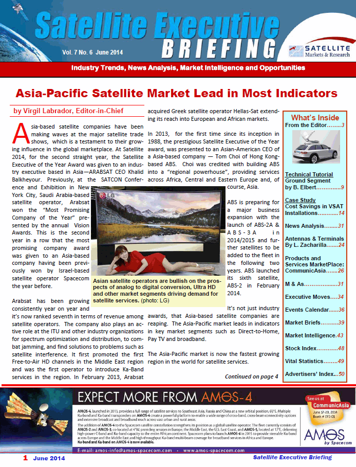 The June 2014 issue focusing on the Asia-Pacific Satellite Market of the Satellite Executive Briefing magazine sponsored by Amos Spacecom is now available. Featuring: