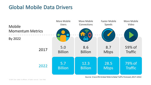 Mobile technologies continue to connect more people and things than ever before. In 2017, there were five billion mobile users worldwide, but over the next five years, that number will increase by half a billion to 5.7 billion users, which represents about 71 percent of the global population. By 2022, there will be more than 12 billion mobile-ready devices and IoT connections (up from about nine billion mobile-ready devices and IoT connections in 2017). By 2022, mobile networks will support more than eight billion personal mobile devices and four billion IoT connections.
