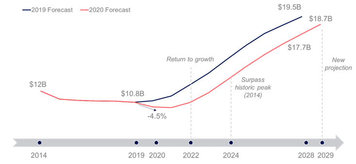 Long-term market drivers for satellite connectivity remain strong and before the pandemic the market was starting to show signs of recovery from the major market price reset. However, due to COVID-19’s impact on bandwidth consumption by cruise ships, commercial airlines, and the energy sector, return to growth previously forecast to begin in 2020 is now unlikely until 2022. According to Euroconsult’s forecast, the satellite and connectivity market is now expected to surpass its historic revenue peak by 2024 and will become an $18.7 billion market by 2029.