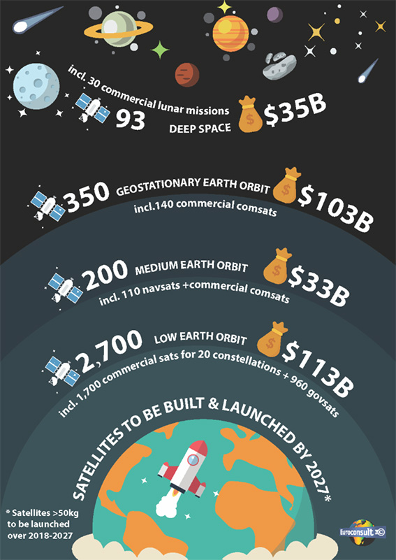 The 3,300 satellites over 50 kg to be launched over 2018-2027 should represent a market of $284 billion for the space industry in terms of building and launching, up 25% over that of the past decade. At the same time, a price decrease is visible in the satellite industry, driven by the commercial constellations of smallsats introducing new production and operation concepts including economies of scale, softwarization, and vertical integration up to data analytics.