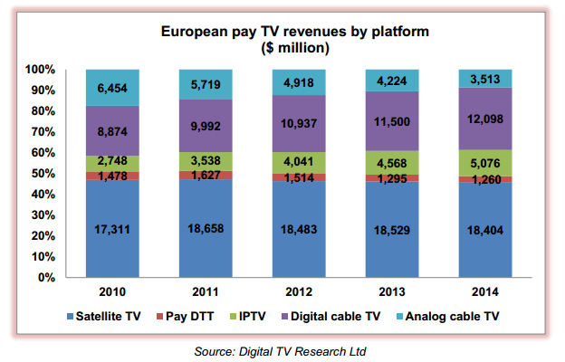 Satellite TV will contribute 45.6% of the pay TV revenues in 2014. However, satellite TV revenues are falling, partly due to greater competition but also due to the growth of cheaper packages, such as Tricolor in Russia, which force down prices for the whole country. Pay DTT revenues are also suffering. However, IPTV will record strong revenue growth. Digital cable revenue growth will compensate for the decline in analog cable revenues.