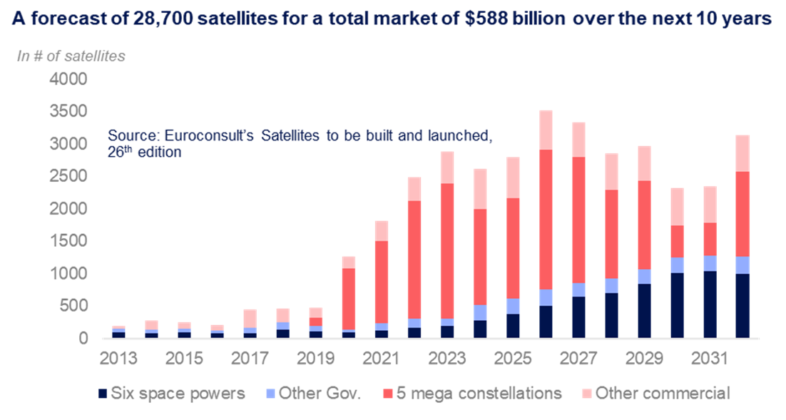 Satellites to be built and launched forecast relies on a thorough satellite demand through an assessment of downstream markets, satellite operators’ strategy and maturity and new players or needs to arise in the future. As the long-term future of satellite demand does not result from the sum of the projects currently known (through satellite backlogs and launch planning), Euroconsult applies various discount factors to them depending on their credibility. Therefore, all constellation-related figures presented were derived from Euroconsult’s assumptions and do not necessarily reflect the views of operators.