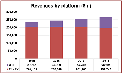 Middlesex, UK, Oct. 21, 2018 — Global revenues from traditional pay TV and OTT TV episodes and movies will reach US$ 265 billion in 2018; up from US$ 254 billion in 2017 and US$ 234 billion in 2015.