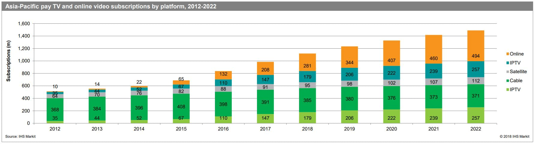 Even with all these shifts in the Asia-Pacific market, the rise of online video does not spell the end of pay TV, according to IHS Markit. That's because IPTV, and to a lesser extent growth in satellite and digital terrestrial television (DTT), will offset the decline in the number of homes subscribing to cable TV, concluded IHS Markit.