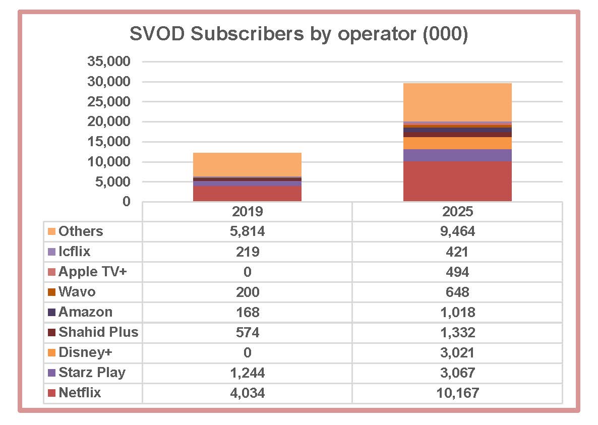 Simon Murray, Principal Analyst at Digital TV Research, said: “We forecast 29.63 million SVOD subscriptions by 2025, up from 12.25 million recorded at end-2019. Collectively, the 13 Arabic-speaking countries will overtake Turkey’s subscriber count in 2025.”