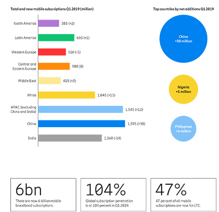 The report says 5G is on a roll. During the second quarter of 2019 several markets switched on 5G following the introduction of new 5G-compatible smartphones. Some communications service providers have set ambitious targets of reaching up to 90 percent population coverage within the first year. As 5G devices increasingly become available and more service providers launch 5G, over 10 million 5G subscriptions¹ are projected worldwide by the end of 2019.