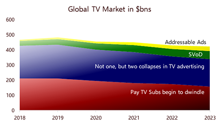 Rethink TV sees US broadcast TV advertising taking the hit first, a full 20% softening in price, only cushioned by some improved uptake of Addressable advertising. This fall will occur over 2019 and 2020, caused by the rising tide of SVoD and vMVPD viewing, which sees broadcast ratings plummet even further.