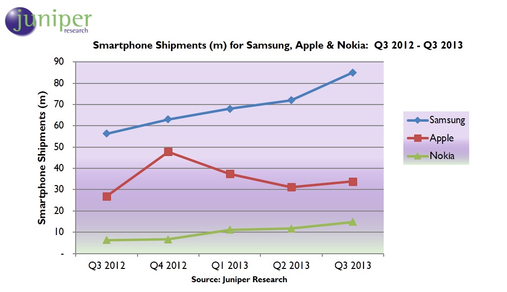 Hampshire, UK, October 29, 2013--Leading hi-tech mobile analysts Juniper Research estimates that the number of smartphone shipments exceeded a quarterly record of 250 million in Q3 2013, representing a y-o-y growth of almost 49% from Q3 2012, and q-o-q growth of 10%. Samsung now accounts for a third of all smartphones shipped with an estimated 85 million smartphones – a record for the company. The company reported a 26% growth in profit, driven by an increase of smartphone sales in both Premium and Economy segments.