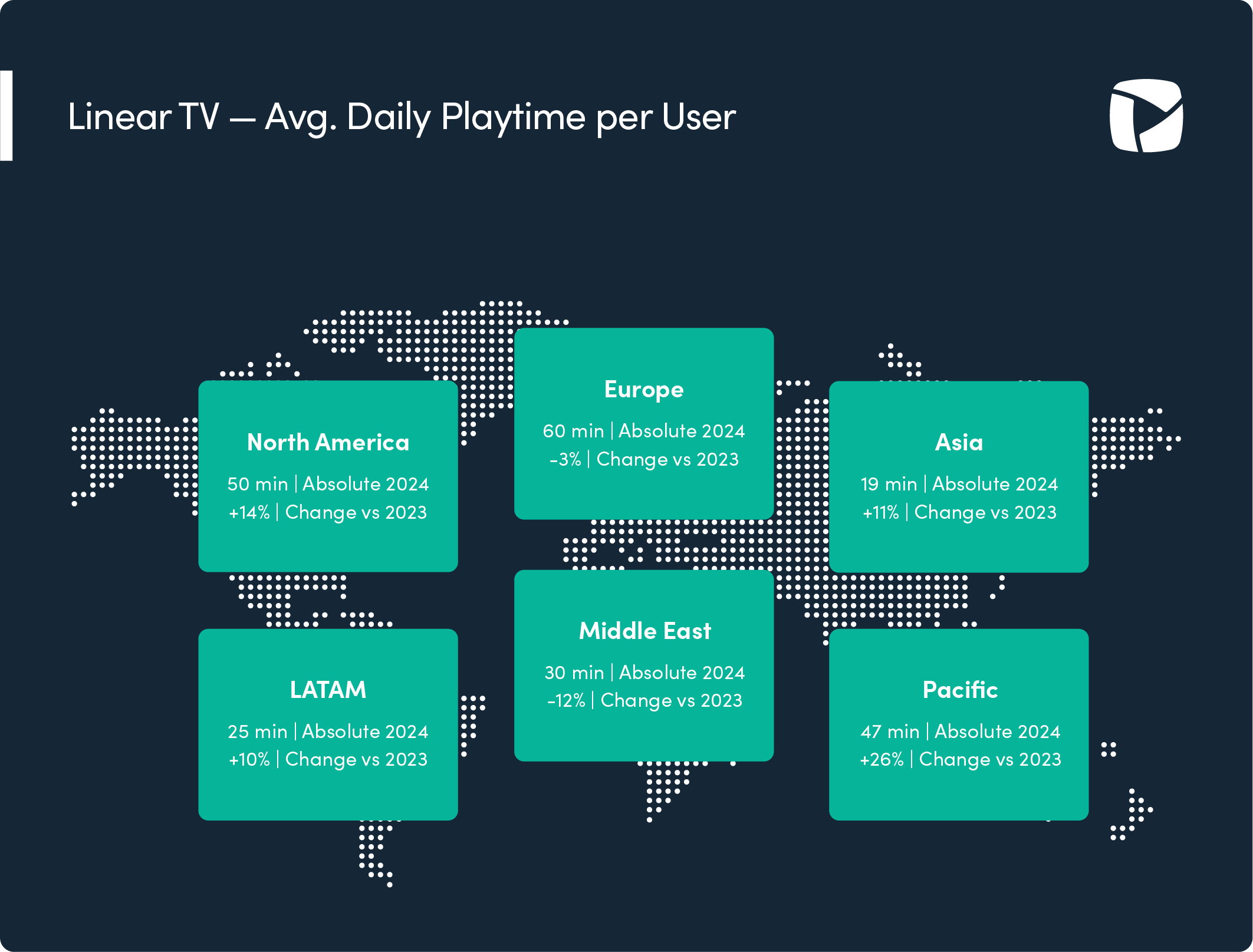 - Regional Linear TV Engagement & Quality Europe continues to be the most engaged region, with ME seeing the largest drop in Avg. Playtime and Titles per User. Quality KPIs in most regions have improved.