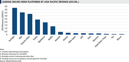 Hong Kong, Sept. 20, 2019 — The Asia Pacific online video industry will generate US$27 billion in advertising and subscription revenue this year, up 24% Y/Y from 2018, according to a new report, Asia Pacific Online Video & Broadband Distribution 2020, published today by Media Partners Asia (MPA). This pie is forecast to expand at a robust 13% CAGR to US$50 billion by 2024, propelled by rising investment and competition, widening broadband access and ongoing development of local content, payment infrastructure and IP protection.