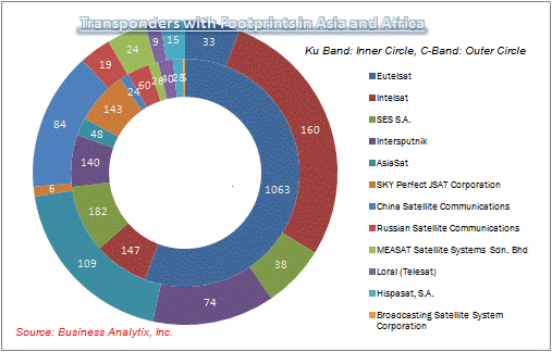 The satellite industry is going through a major transformation. It is developing a significant “long tail” (see accompanying chart of transponders with footprints covering Asia and Africa) with increasing number of regional and niche players making an effort to make their mark. These new entrants, with substantial headroom for expansion in Latin America, Asia, and Africa; have access to profitable markets and can create viable business if they are successful in raising initial capital at low cost. This is where the role of export finance fits into the satellite ecosystem perfectly.