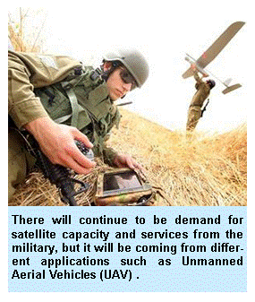 There will continue to be demand for satellite capacity and services from the military, but it will be coming from different applications such as Unmanned Aerial Vehicles (UAV) and might shift to other regions such as the Asia-Pacific, where booming economies and rising security tension are fueling military buildup.