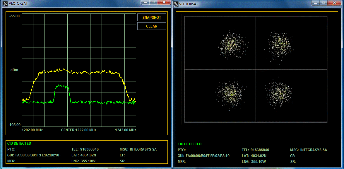 VectorSat is also capable of detecting CID on a Carrier-Under-Carrier satellite interference scenario with the maximum accuracy. The screenshot shows an example, of a QPSK modulation TV transponder, which has been interfered by a hidden carrier that could not be analyzed without using VectorSat. The service has been degraded, therefore, the satellite operator has been requested to use VectorSat to help mitigate this interference.