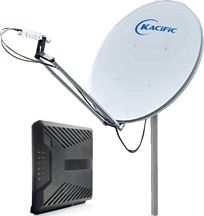 | Kacific's terminal kit consisting of low power, high throughput ST Engineering iDirect MDM2010 IP Satellite modem, its paired iLNB 3210 transceiver, and the 1.2m VSAT antenna. |