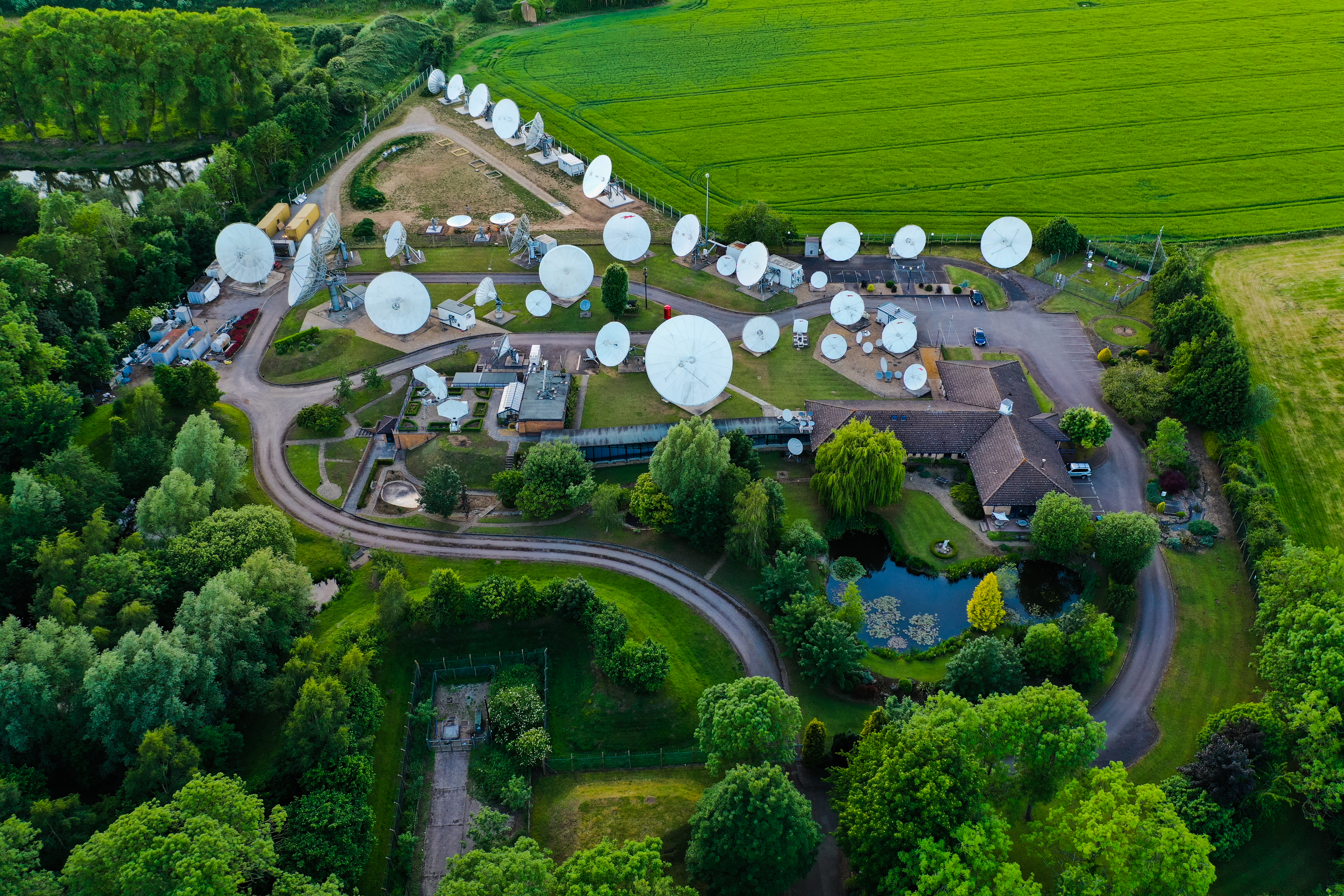 SMS-Teleport, Rugby, UK; SMS Teleport is strategically located in the beautiful British countryside; with an array of over 40 state of the art antenna systems, it is stationed carefully to provide a clear, extensive, and uninterrupted line of sight to over 100 different communication satellites – located from the 60° East to 60° West orbital positions.With exclusive, fully redundant network connectivity to multiple Points of Presence in London and across the globe; our Teleport facility offers the optimal infrastructure for providing essential and reliable satellite communications. View the video click here.