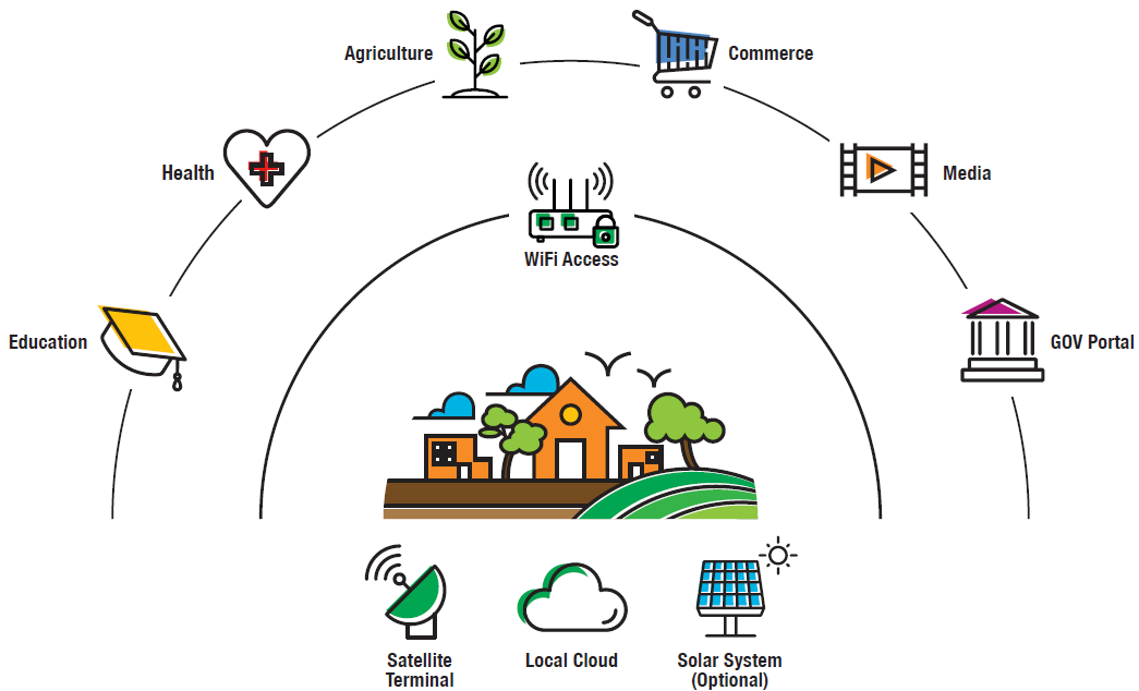 It provides access to media-rich content stored locally or on the internet, specific for services as healthcare, education or agriculture, as well as entertainment, news, weather, government messages and OTT access to national broadcast, local TV and radio.